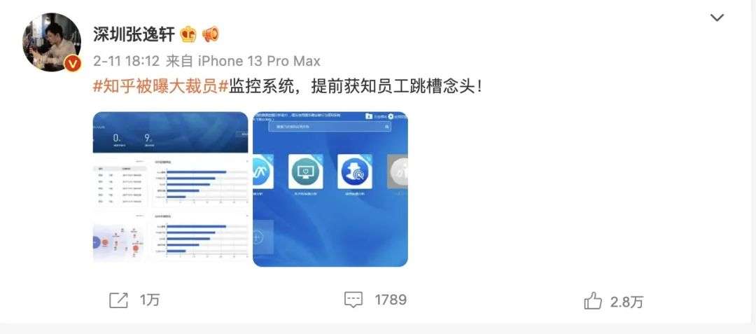 2月11日,网友@深圳张逸轩在社交平台上称,有监控系统能提前获知员工跳槽念头,并附上系统监控页面图。