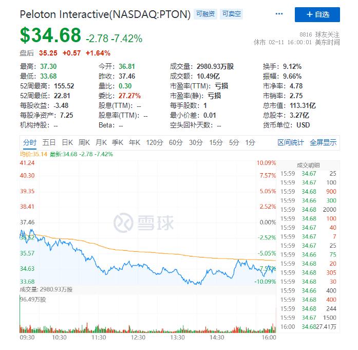 这在Peloton股价上体现得淋漓尽致。经历了疯狂的2020年后,Peloton股价在2021年一路震荡下跌,最新报价34.68美元/股,相较于曾经的高点155.52美元/股,跌幅超75%。最疯狂的时候,Peloton市值高达500亿美元,如今已经蒸发了近400亿美元(约合人民币2500亿元),令人唏嘘。