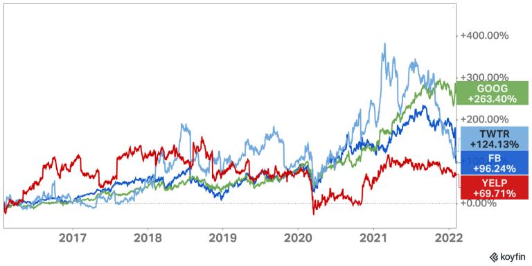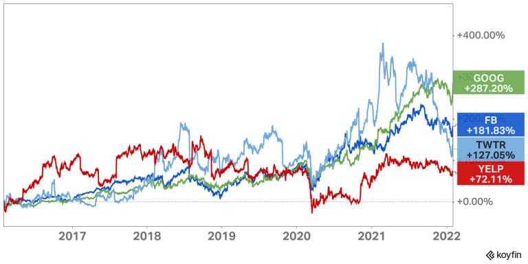 Google、Facebook、Twitter 与 Yelp 过去六年的市场收益对比