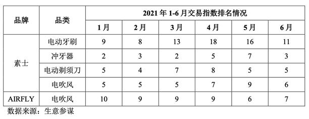 据招股书显示2021年6月,素士电动牙刷在天猫平台的交易指数排名第11、冲牙器排名第3、电动剃须刀排名第5、电吹风排名第6。
