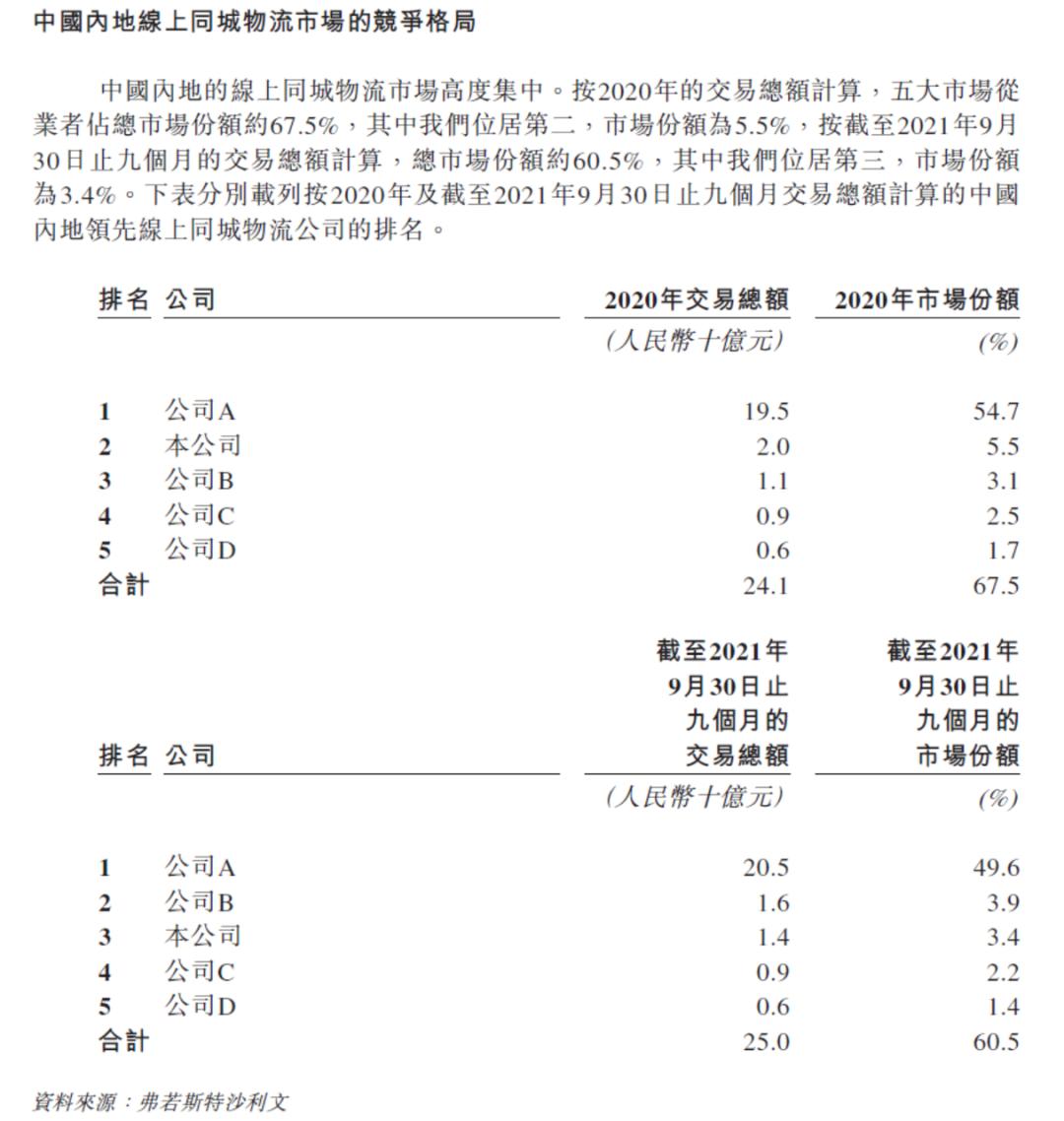 根据快狗打车招股书披露,2020年全年,公司全年交易总额为人民币20亿元,市场份额为5.5%,与市场第一的公司A相比,业务量仅为其1/10。而公司A不出意外,正是货拉拉。