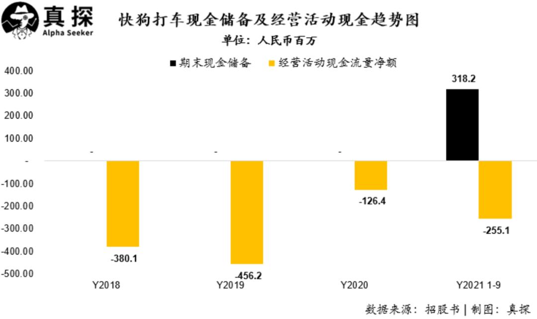 长期且持续的亏损,已经对快狗打车的现金储备带来了极大压力。在2018年至2021年1-9月期间,快狗打车的经营活动现金净流出分别为3.8亿、4.56亿、1.26亿和2.55亿元人民币,而截止2021年9月末,公司可动用现金储备仅为3.18亿元。