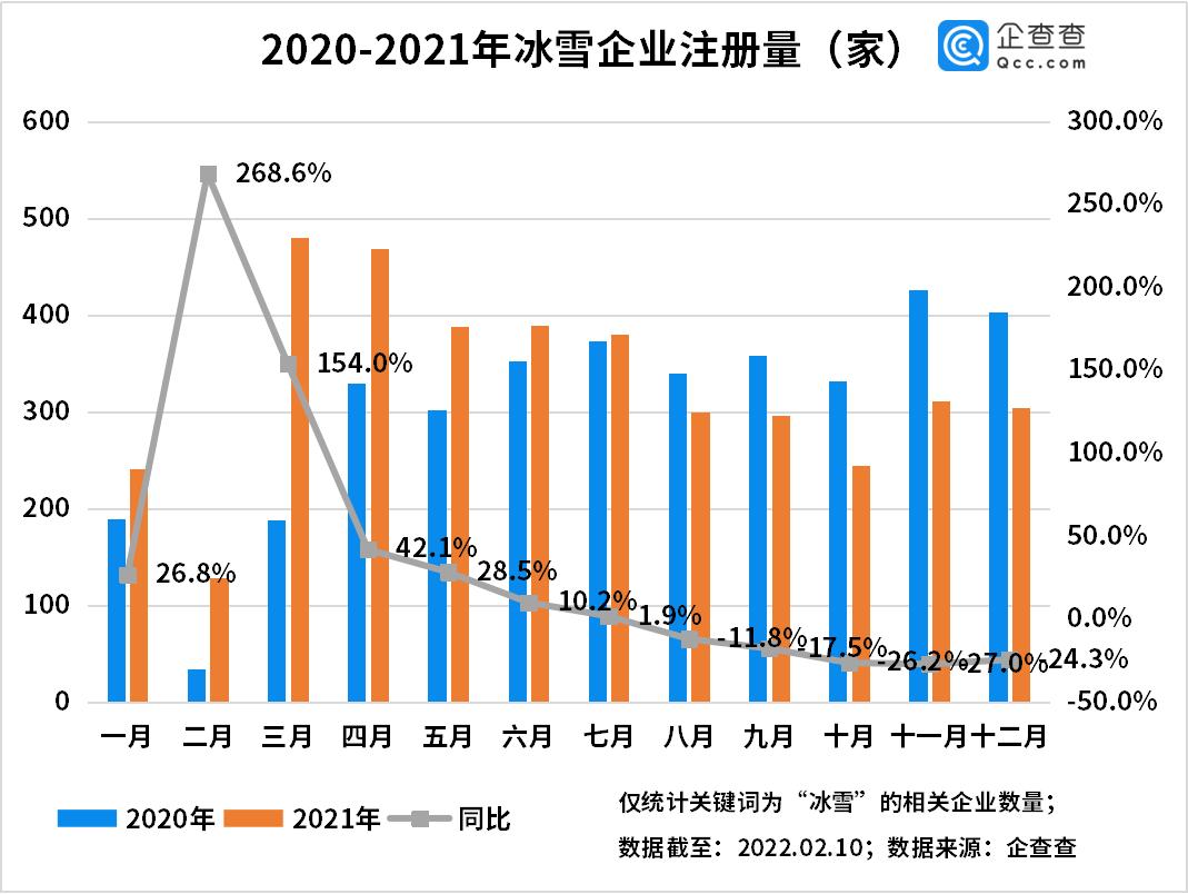 企查查研究了2020年与2021年两年冰雪企业注册量的月度数据,2021年上半年,冰雪企业每月的注册量较去年同期增速较快,尤其是二月和三月,分别同比增长268%和154%。2021年下半年增速出现放缓,同比甚至出现负增长。