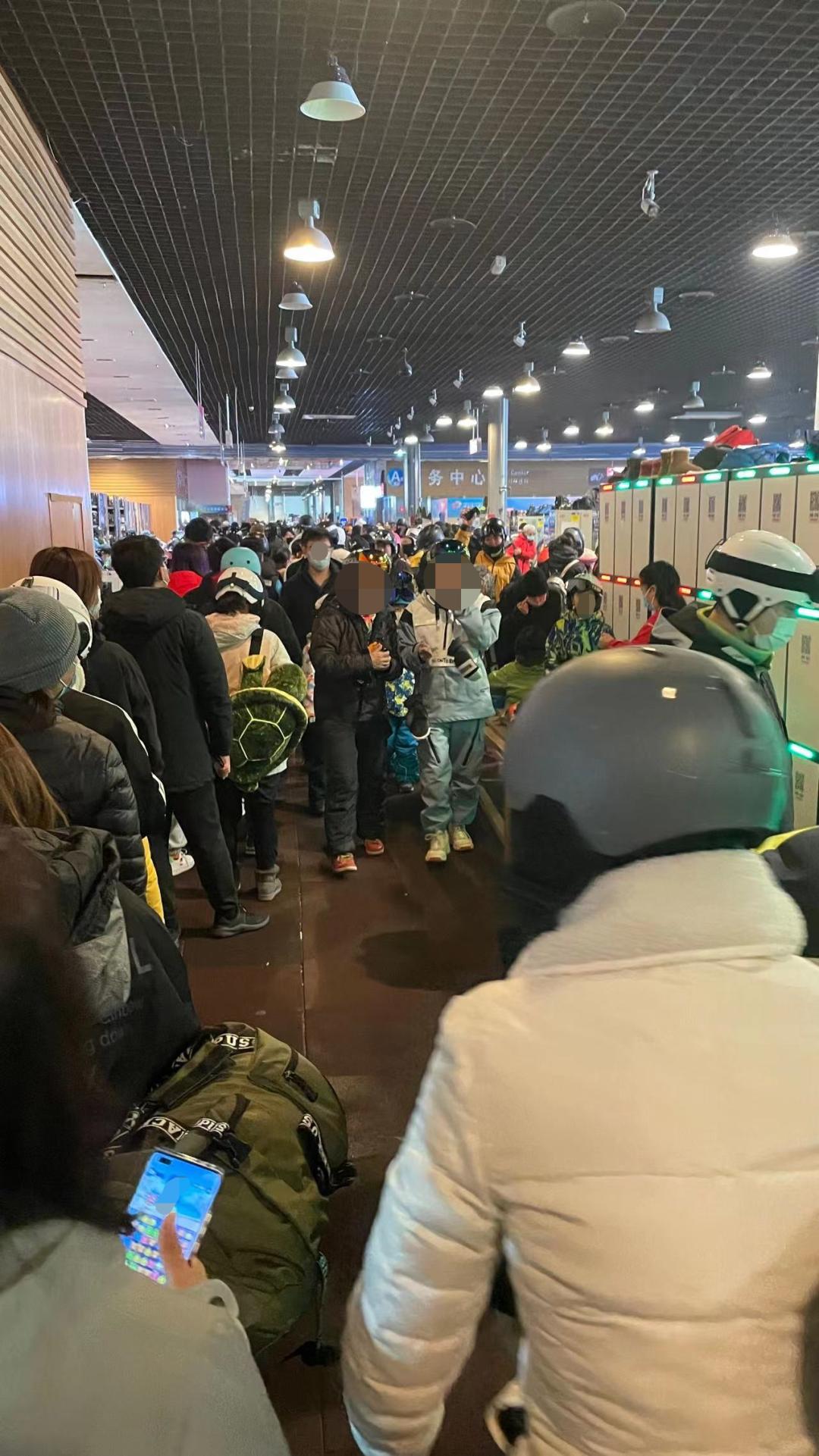 排队办完雪票进入大厅后,租雪鞋和雪板的地方已经大排长龙,队伍连续绕了两圈,张先生租完雪鞋后发现雪板那边已经断码(号码不全)了。还好孩子的教练帮忙,最终家人都幸运地抢到雪板,而据张先生反映,单板雪板在早9点以后,就没有了。