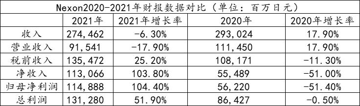 财报显示,2021年Nexon收入同比下降6.3%至2745亿日元(23.79亿美元),营业收入下降17.9%至915亿日元(7.93亿美元)。归母净利润达1149亿日元,同比上涨104.4%;总利润达131.3亿日元,同比上涨51.90%。