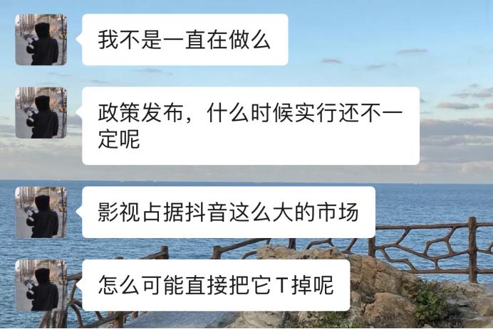 对于版权问题,拥有1405.7万粉丝的博主阿天影视剪辑则告诉锌财经, 版权问题可以通过手法规避。 “政策虽然发布,但什么时候执行还不一定,影视占据抖音这么大市场,怎么可能直接把它踢掉。”