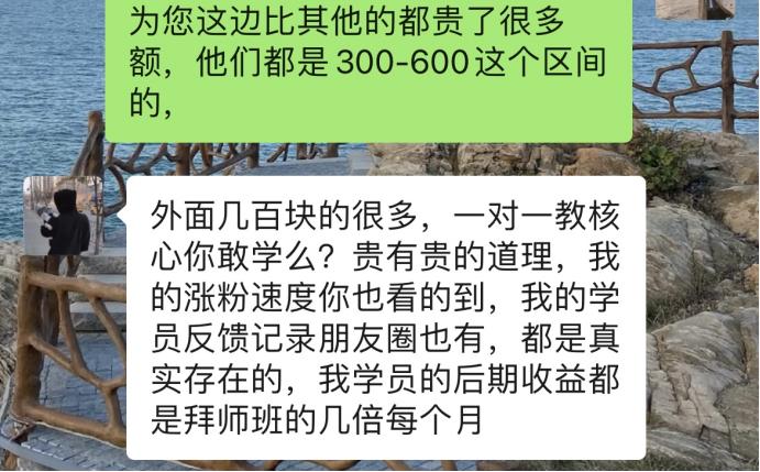 对于价格为何如此之高,阿天影视剪辑表示:“贵有贵的道理,我的涨粉速度你也看得到,我的学员反馈记录朋友圈也有,都是真实存在的,我学员的后期收益每个月都是拜师班的几倍。”