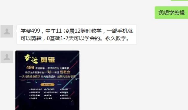 以幸运剪辑为例,其教学价格为499元,时间从中午11点到凌晨12点,随时教学。幸运剪辑称,只要一部手机,即便0基础,1-7天就可以学会,且是终身教学,后续不再收费。