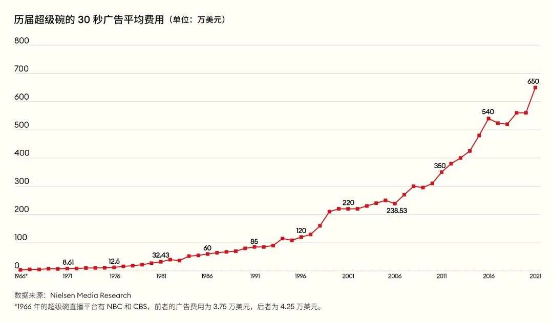 除了球队夺冠,超级碗广告也是备受品牌商和民众关注的焦点,而前者为了曝光更是不惜血本。负责对本次超级碗进行直播的NBC(美国全国广播公司)表示,其在2月初已经卖掉了超级碗的所有广告位,而一些30秒广告的售价达到了创纪录的700万美元。相比之下,在1967年的首届超级碗中,一则广告的平均售价为3.75万美元。