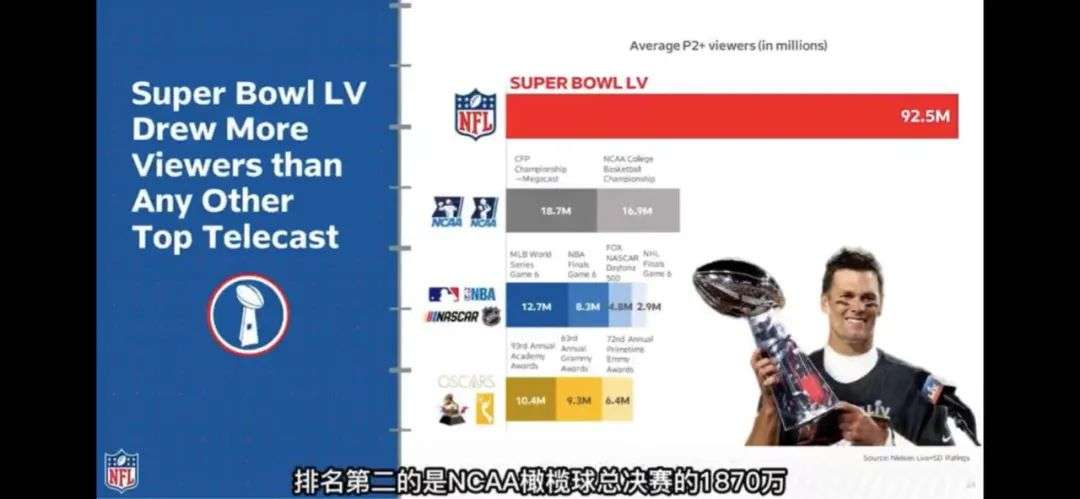 根据此前相关数据显示,NFL超级碗在美国本土的平均收视数据高达9250万人次,处于遥遥领先的地位。甚至高于排名第二的NCAA橄榄球总决赛和排名第三的NBA总决赛之和。这也是各大品牌选择超级碗进行电视广告投狂潮的主要原因。