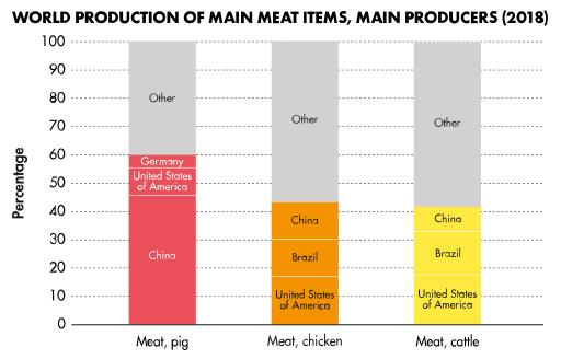 2018年,中国猪肉产量占了全球猪肉产量的40%多(最左边红色柱状图) 图/wikipedia