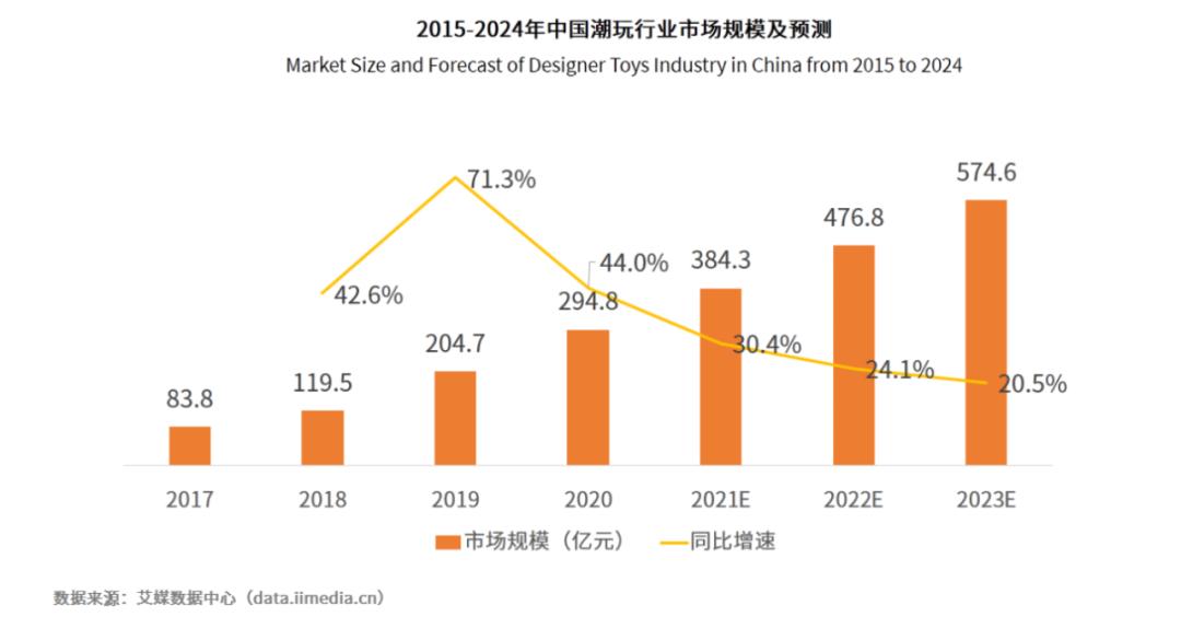 来自艾媒咨询发布的《2021年第一季度中国潮玩行业发展现状及市场调研分析报告》显示,2019年中国潮玩市场规模为204.7亿元,同比2018年增长了71.3%,受疫情影响,2020年中国潮玩市场规模增速有所下降,市场规模为294.8亿元,预计到2024年,中国潮玩的市场规模将增至763亿元。