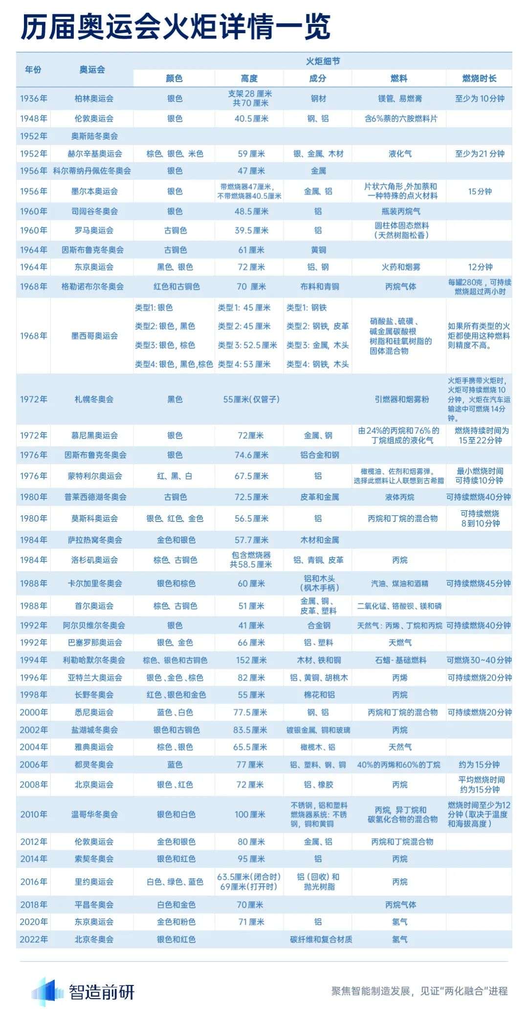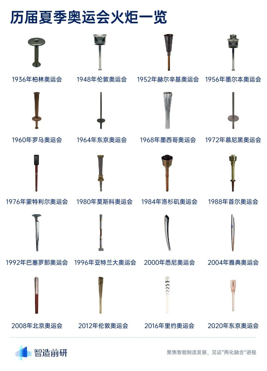 现代奥运会火炬传递仪式,经历了三个发展时期 1896 至 1932 年的酝酿萌芽期、1936 至 1980 年的仪式形成期和 1984 年至今的创新发展期。经过 80 余年的发展完善,火炬传递已经形成了完善的仪式。智造前研对过去的 39 届奥运会的火炬细节做了详细的统计。