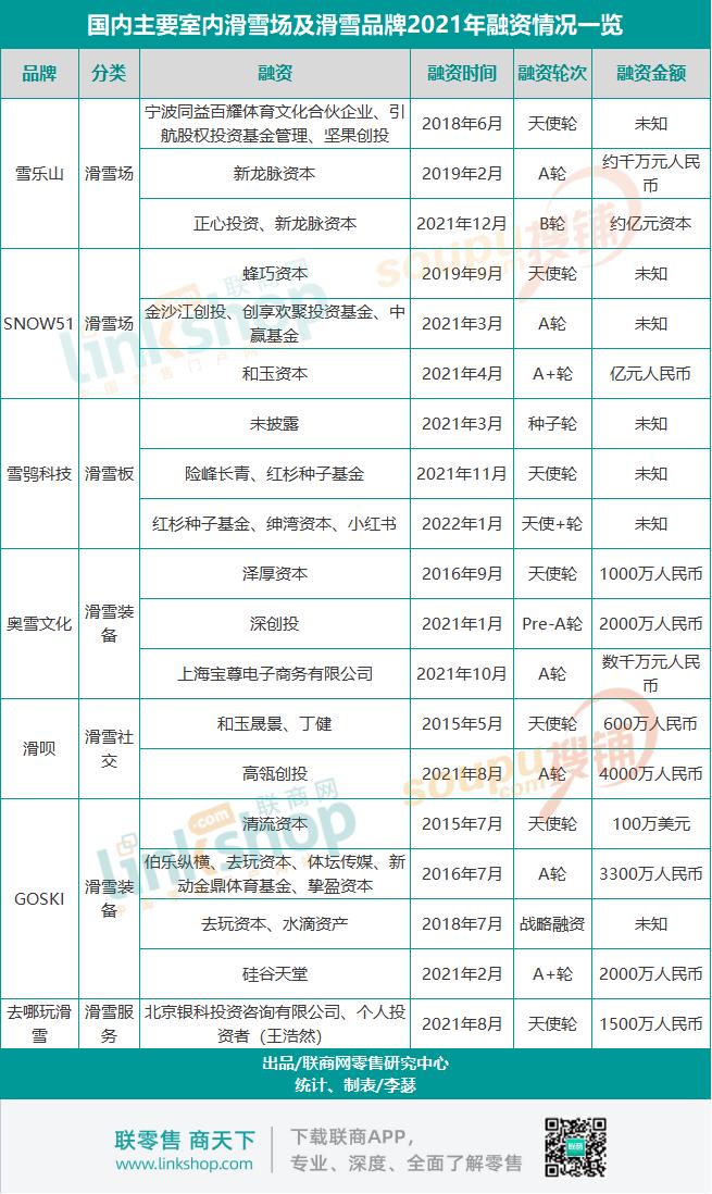 《联商网》统计发现,2021年获得融资的项目均集中在滑雪领域,包括滑雪设备、场地以及相关社交平台。其中,单笔融资金额最高的是室内滑雪场馆雪乐山滑雪获得的1亿元B轮融资。