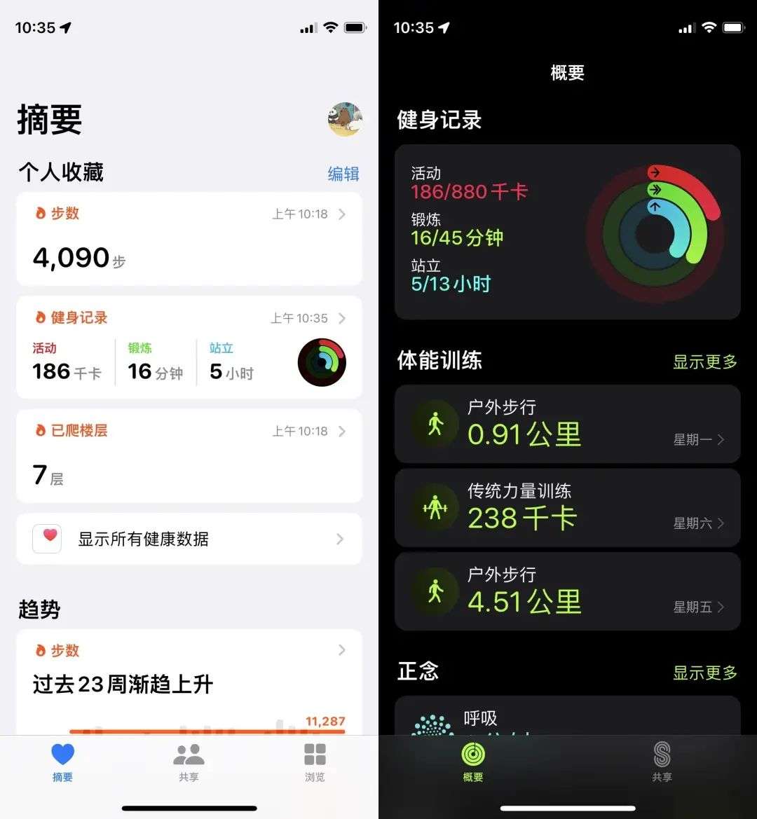 Apple Watch 经历过数代革新,逐渐明确自身运动健康助手的属性及定位后,苹果官方出品的《健康》和《健身》两款 app 各司其职,前者收归各类身体指标,数据包罗万象,甚至可以作为医生进行医疗诊断时的参考;后者则以「三环」为基础,更专注于运动健康。