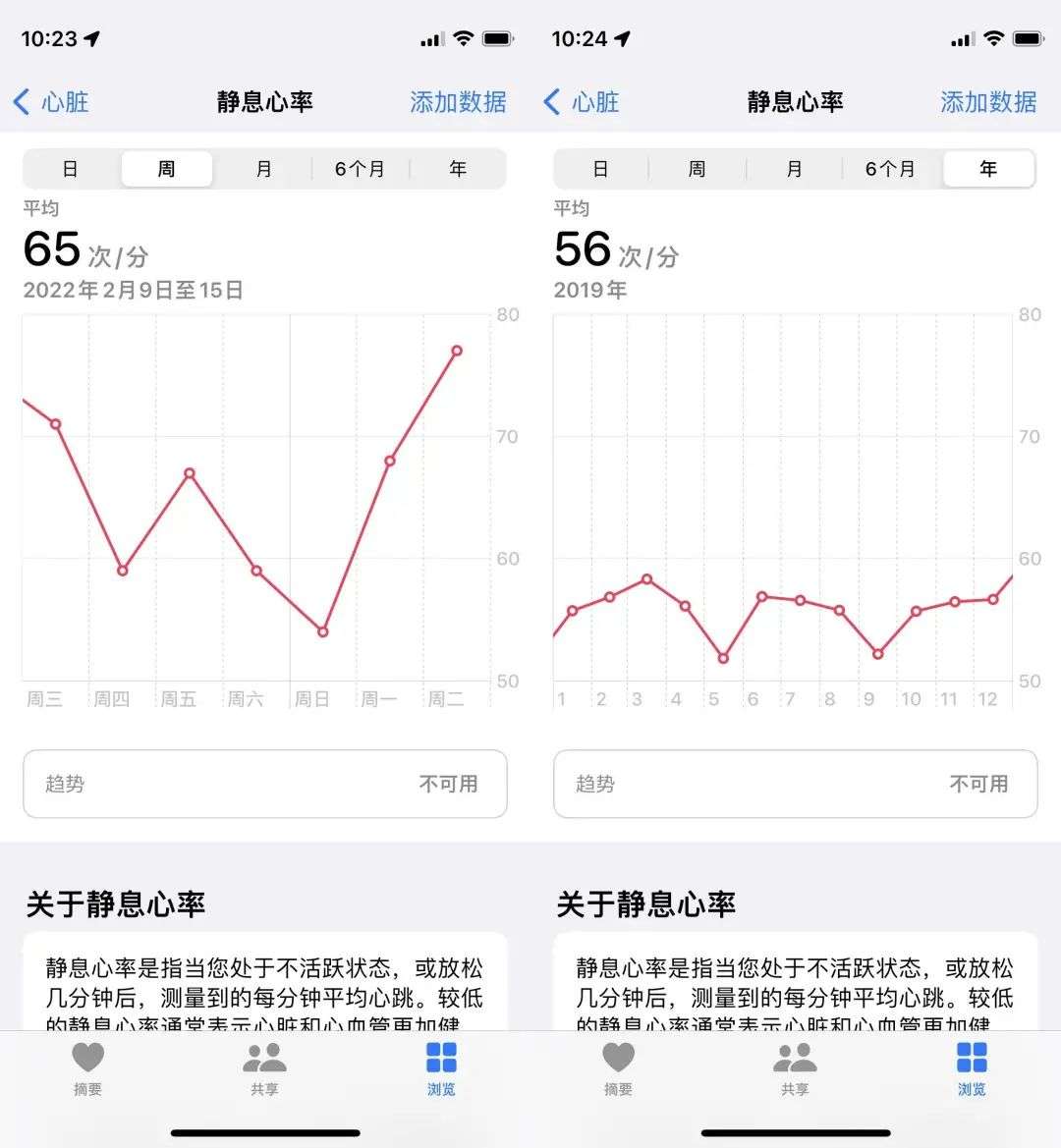 还是以我的数据为例,近期我的静息心率都在 65 次/分上下徘徊,而当我会看 2019 年的数据,因为保持着夜间慢跑的习惯,那一年我的静息心率皆低于 60 次/分,属于生理性调整,是好事。
