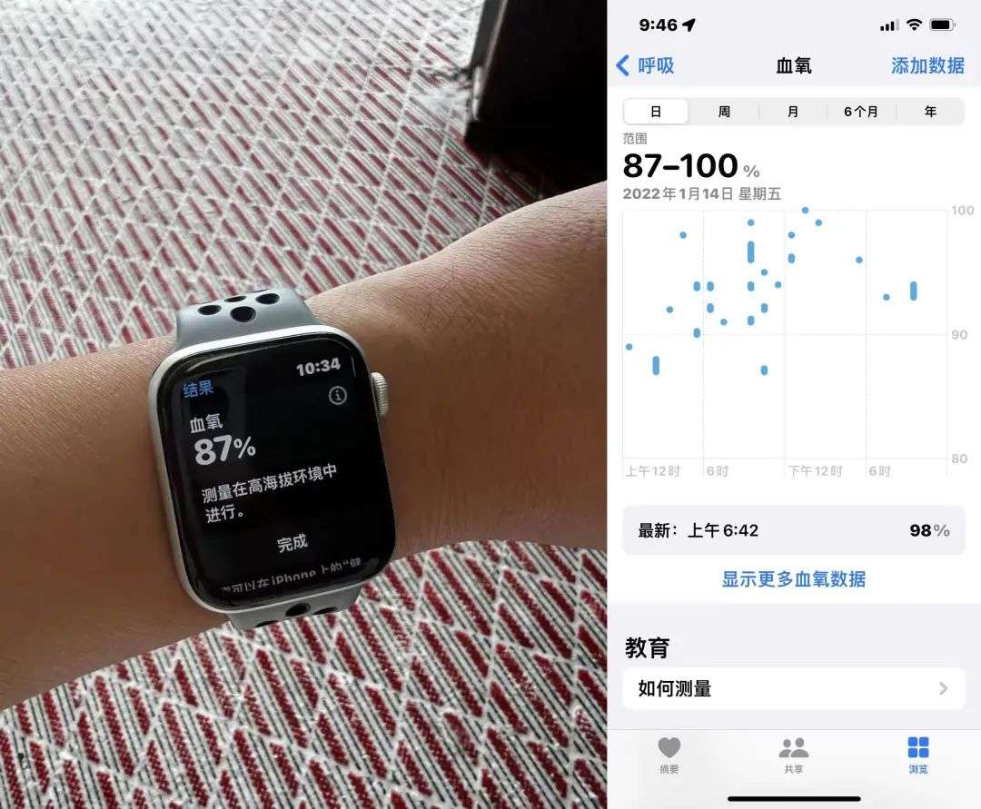 于是为了进一步判断身体是否适合继续登山,他用 Apple Watch 测量了当下的血氧情况,已经降至 XX 了,勉强登山只会加剧高反。