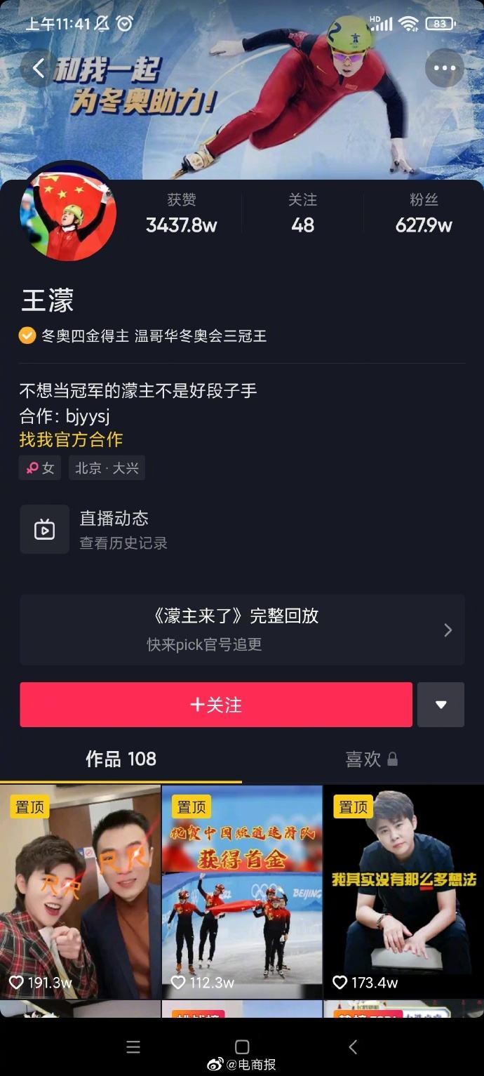 王濛为咪咕视频贡献了巨大流量。冬奥开幕以来,咪咕视频一度冲上 App store 免费排行总榜第二名。其下载量直线上升,从单日8万多增至33万次,日活用户实现了近10倍的增涨。抖音账号“咪咕体育”,每天涨粉高达11w+,传播指数居于抖音榜单第2位。2月9日,咪咕身后的中国移动股价一度增长7.4%甚至涨停,市值暴涨近1300亿。