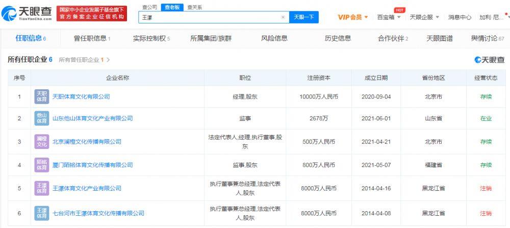天眼查App显示,王濛所有任职企业共6家,其中存续状态有4家,分别为天职体育文化有限公司、北京澜橙文化传播有限公司、山东他山体育文化产业有限公司、厦门陌铭体育文化传播有限公司。王濛在上述四家公司担任高管,同时持有3家公司的股份。