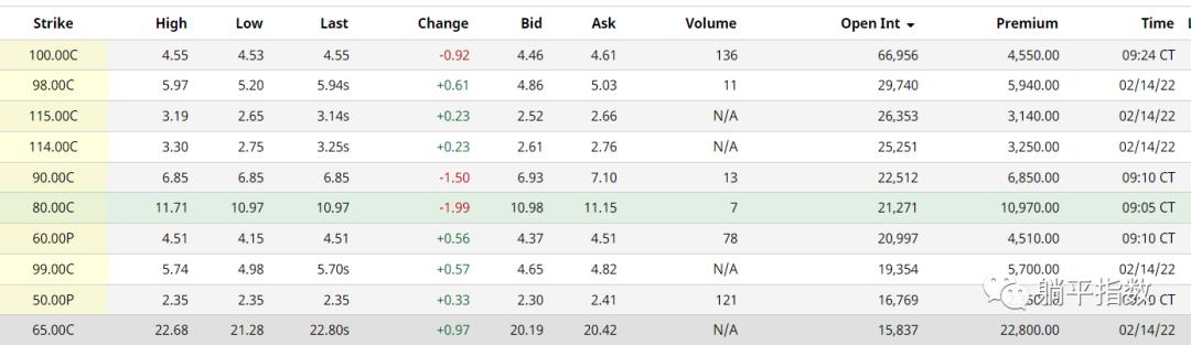 如上图所示,去年这个时候,一份到期日为2022年12月、执行价为110美元/桶的WTI原油的看涨期权售价是31美分,现在则接近4美元。北京时间2月15日当晚,在WTI原油价格下跌4.37%的情况下,这份合约的期权价却上升了7.51%。翻看其他几份高执行价看涨期权的价格亦是如此,在油价高涨的这几个月中,美股原油市场的多头力量已经起势。