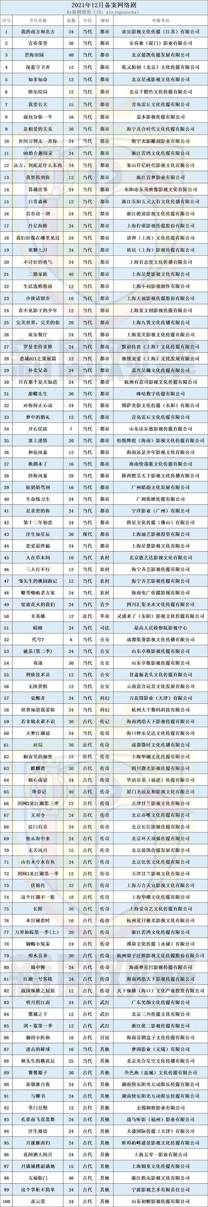 12月网络剧备案100部,现实题材占比63%