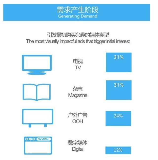 1. 传统大众媒体依然在消费需求早期起到关键作用(第一张图电视/杂志/户外广告占据比例均高于数字媒体)。