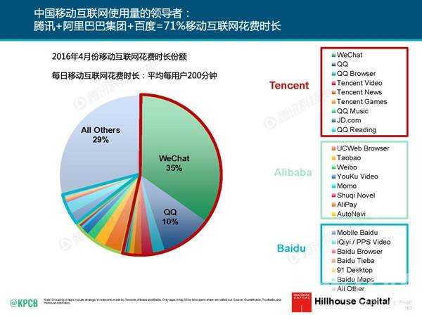 报告所传递的直观信息:BAT三大巨头已经在移动互联网上形成了时间(流量)的垄断(三家合计占据71%以上)。但这张图背后揭示了一个什么事实?