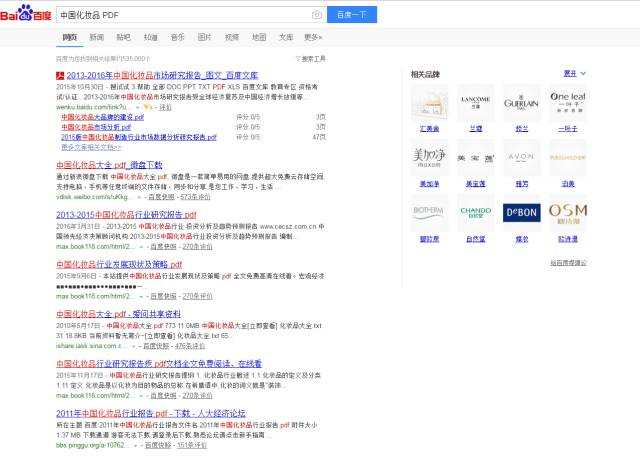 比如百度“中国化妆品 PDF”,就会得到如下结果,接下来一个个点进去看就行了: