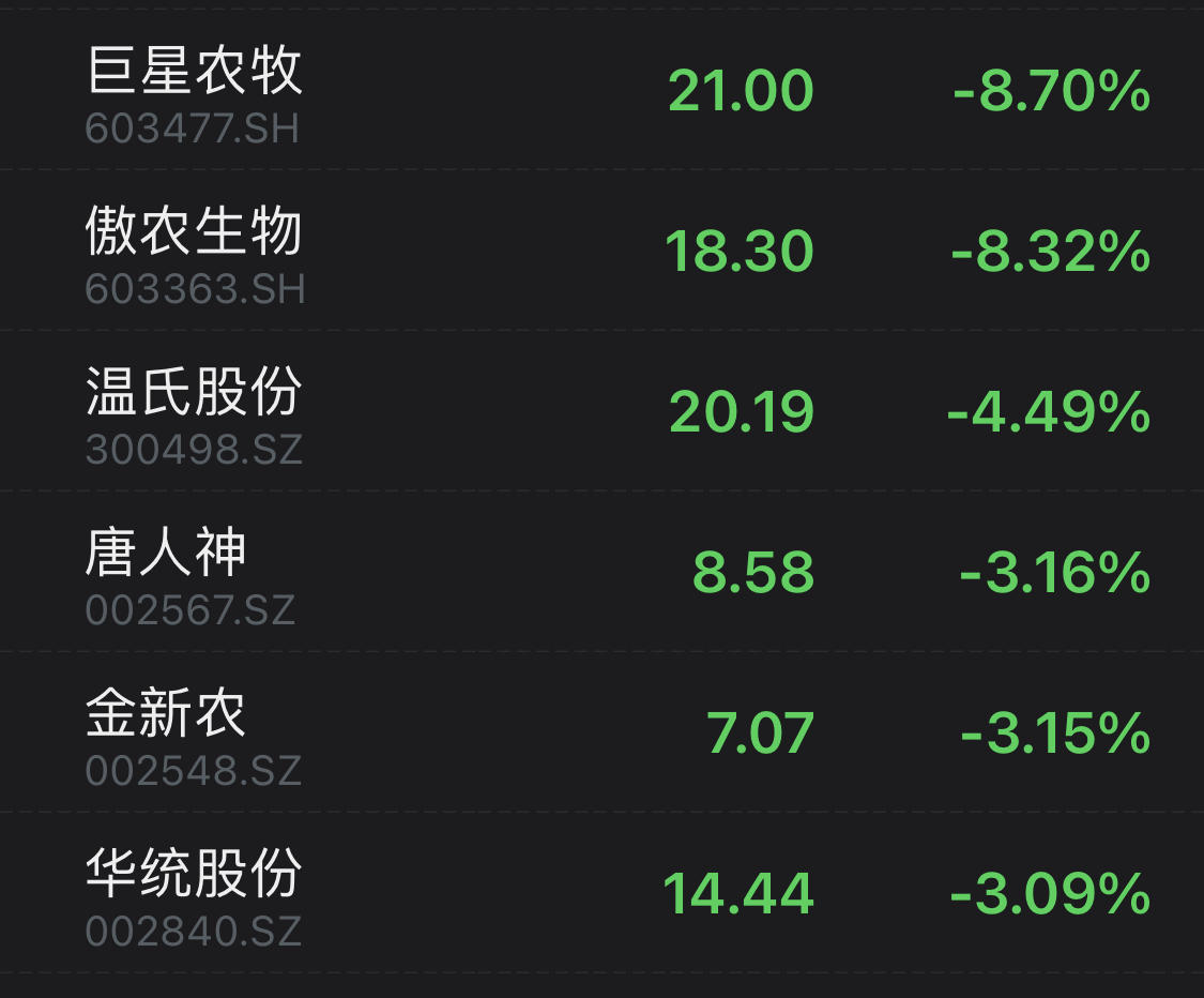 猪肉股早盘走低,巨星农牧、傲农生物跌超8%,温氏股份跌超4%,金新农、唐人神等跟跌。