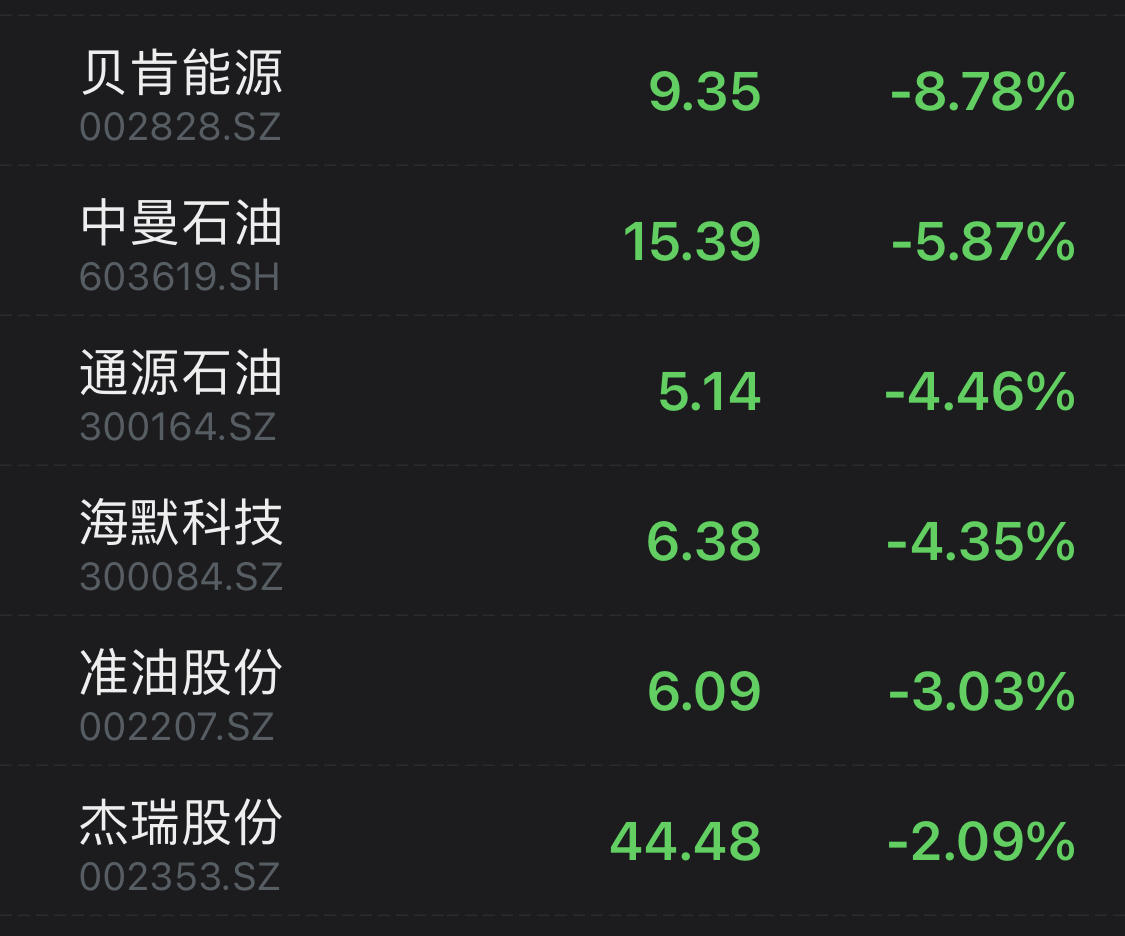 午后,指数回落,创业板指一度翻绿,石油板块继续走低,贝肯能源收跌近9%,中曼石油、通源石油、海默科技、准油股份等跌幅居前。
