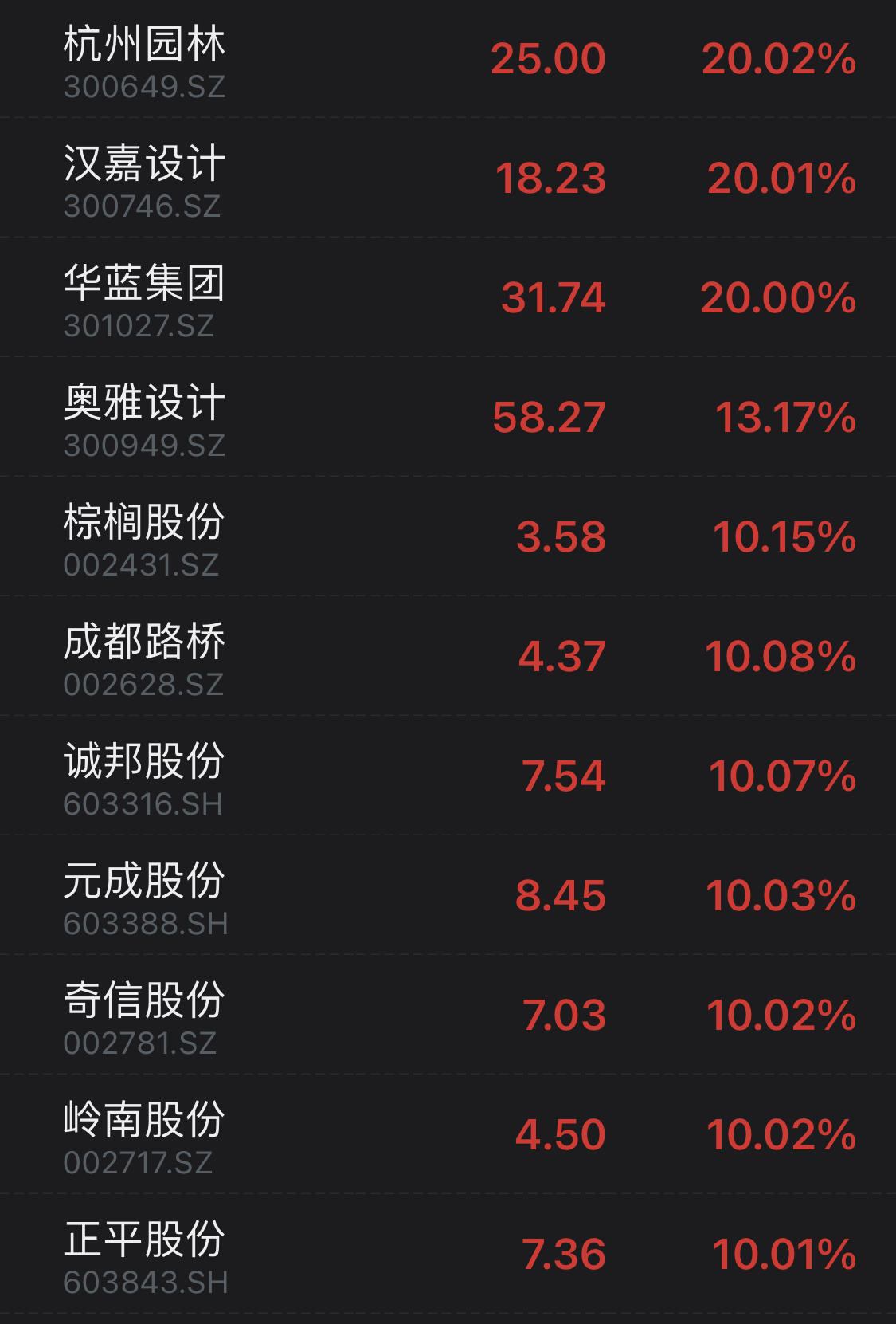 基建板块现涨停潮,创业板股杭州园林、汉嘉设计涨停,棕榈股份、天沃科技、成都路桥、城邦股份、浙江建投、宁波建工、正平股份、中国海诚等超20只个股涨停。