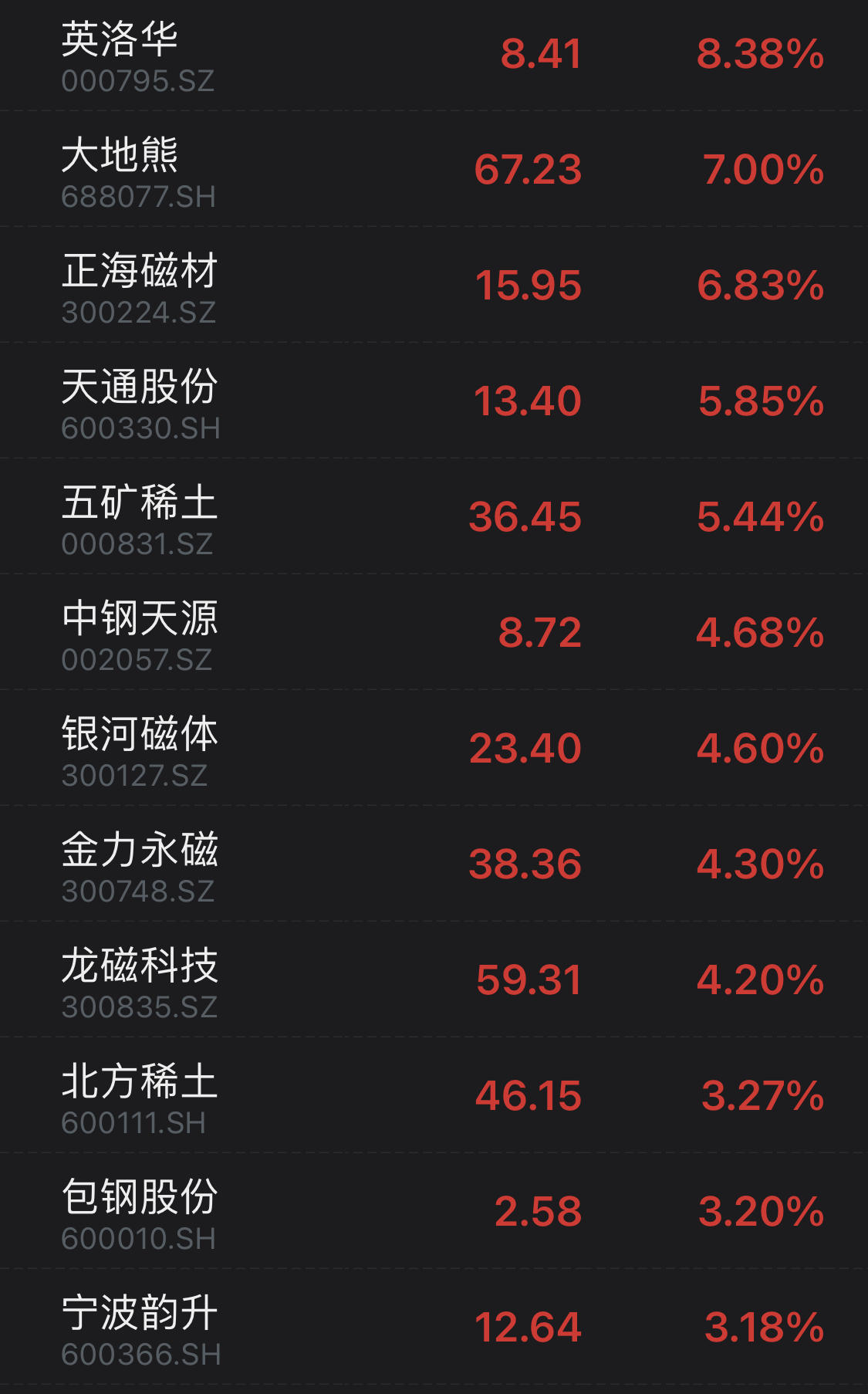 此外,在稀土价格催化下,稀土永磁概念表现亮眼。五矿稀土盘中涨超9%,北方稀土、盛和资源、龙磁科技、宁波韵升、横店东磁等跟涨。中国稀土行业协会数据显示,2月15日稀土价格指数为426.8,续创历史新高。