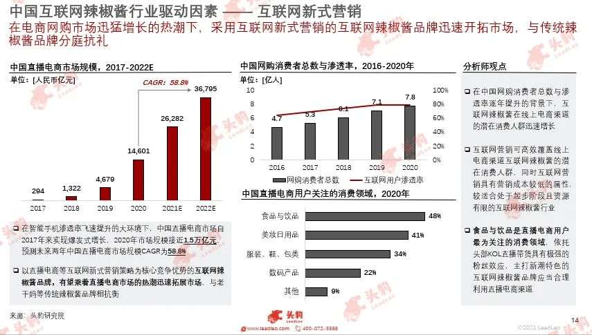 在中国网购消费者总数与渗透率逐年提升的背景下,互联网辣椒酱在线上电商渠道的潜在消费人群迅速增长。