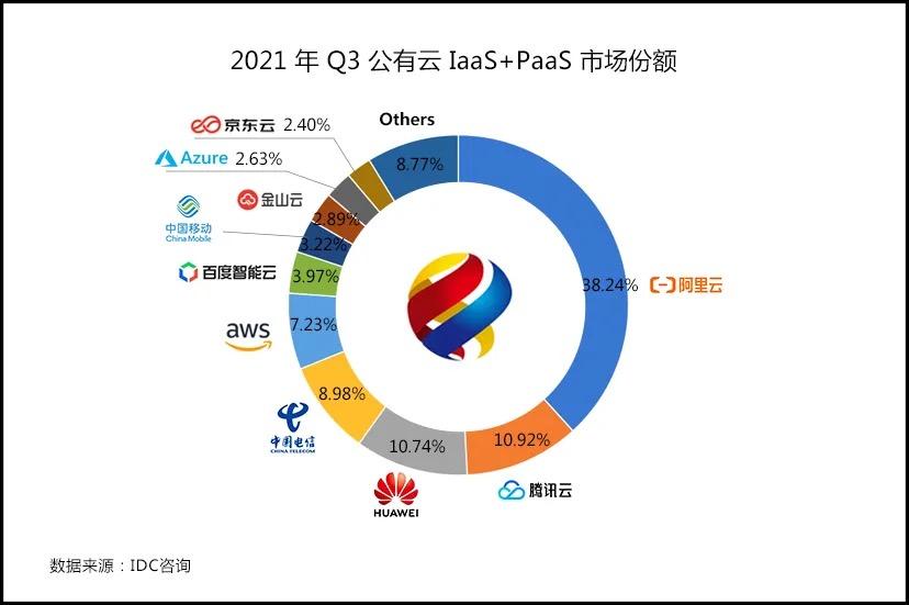 其中,在备受关注的2021年Q3公有云IaaS+PaaS市场份额上,阿里云市场份额为38.24%,位列第一;腾讯云市场份额为10.92%,位列第二;华为云市场份额为10.74%,位列第三。