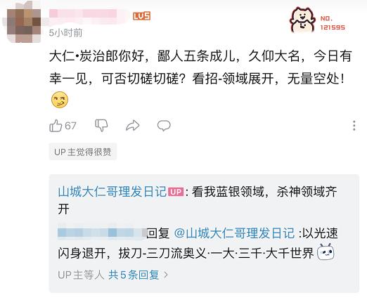 在“大仁哥”最新一期视频中,他扮成动漫《鬼灭之刃》中的人气主角灶门炭治郎为顾客理发。在B站评论区,有网友用其他动漫梗进行回应。