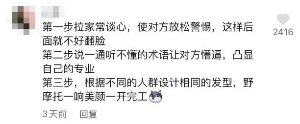 有热心网友总结出“李店长”的理发套路。虽然“李店长”的理发风格自成一派,但显然达不到“换头”的颜值升级要求,目前他的抖音粉丝停留在32.4万。