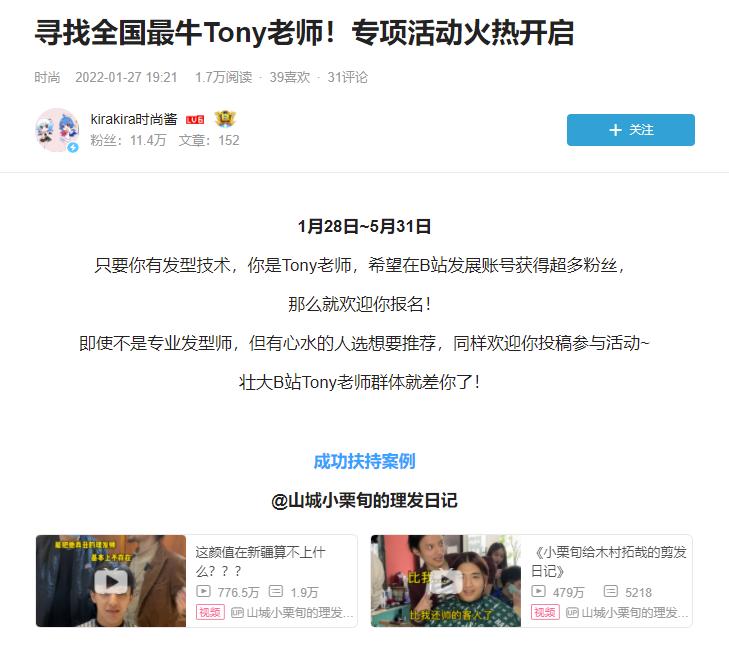 1月27日,B站时尚区官方账号发布了一篇题为《寻找全国最牛Tony老师!专项活动火热开启》的文章,通过现金与流量等多重激励政策,吸引Tony老师们的加入,“小栗旬”便是成功扶持案例。