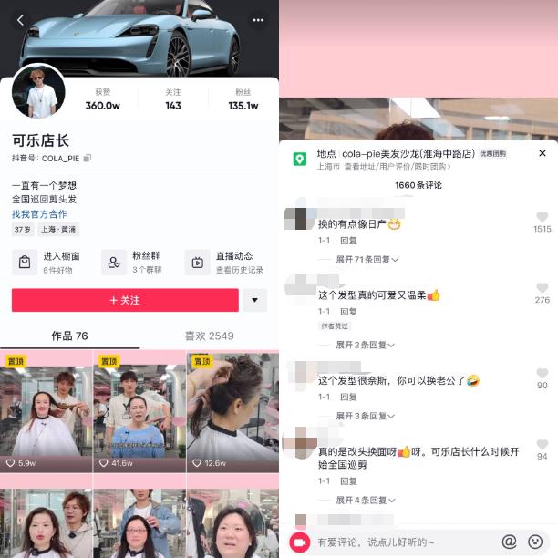 2018年开始,“可乐店长”也将抖音作为运营阵地之一,发布自己为顾客理发的前后对比视频,目前已经积累135.1万粉丝。他在抖音首页写着“一直有一个梦想,全国巡回剪头发”,在评论区,经常有人询问他的店铺位置,如何预约。