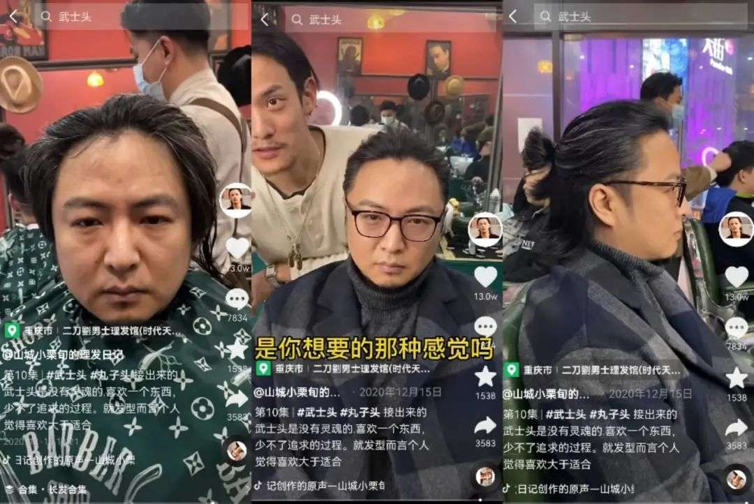 早期,“小栗旬”在抖音发布过男士发型推荐、男士理容展示、个人对口型等不同类型的视频,点赞量普遍在1万以下。从2020年底起,他逐渐形成“询问需求+剪发过程+剪完后对比”的短视频模式,武士头是首个爆款视频,点赞达13万。