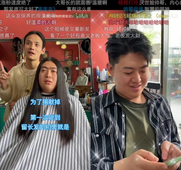 像这位爱心人士要剪下留了3年多的长发,捐赠给需要头发的癌症患者,“小栗旬”为他免单表示心意,双方温暖的行为获得了89万次点赞,也是目前“小栗旬”播放量最高的视频。