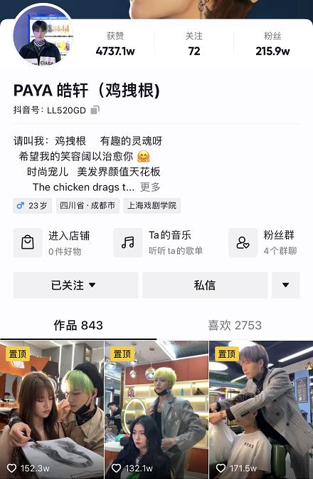 在“PAYA 皓轩(鸡拽根)”抖音首页置顶的三条视频中,他先是与小姐姐近距离贴面作画,再对多位顾客使出摸头杀,最后误拽顾客衣服线头,产生一场笑话。虽然这三条视频没有展示理发技巧,但点赞量均超过100万。对比他发布的顾客理发视频,后者点赞量只在1万上下浮动。