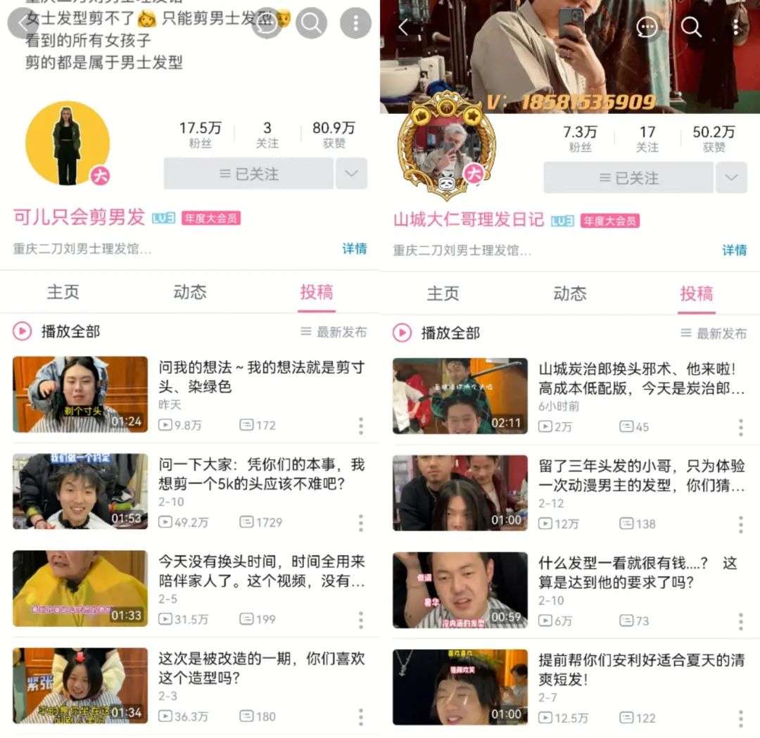 其实早在2018年,他就开始在抖音上发布短视频,今年初才将部分作品同步至B站,但是后者蹿红速度远超前者,并且自家店铺的其它理发师也陆续开设B站账号,吸引了不少慕名前来剪发的粉丝。