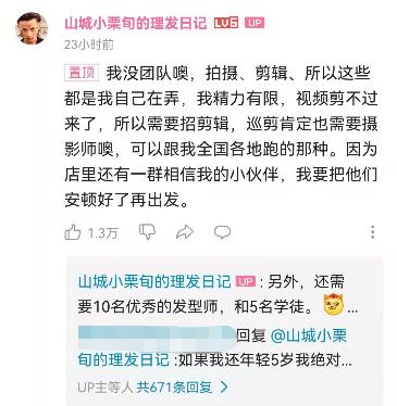 或许是感受到理发+拍摄剪辑的工作量压力。2月14日,“小栗旬”发布了一条题为《全国巡剪在筹备了,我想感受一下哪里呼声要高一点。》的视频,并在B站评论区置顶了一条招聘摄影、剪辑、发型师、学徒的消息,强调自己没有团队。