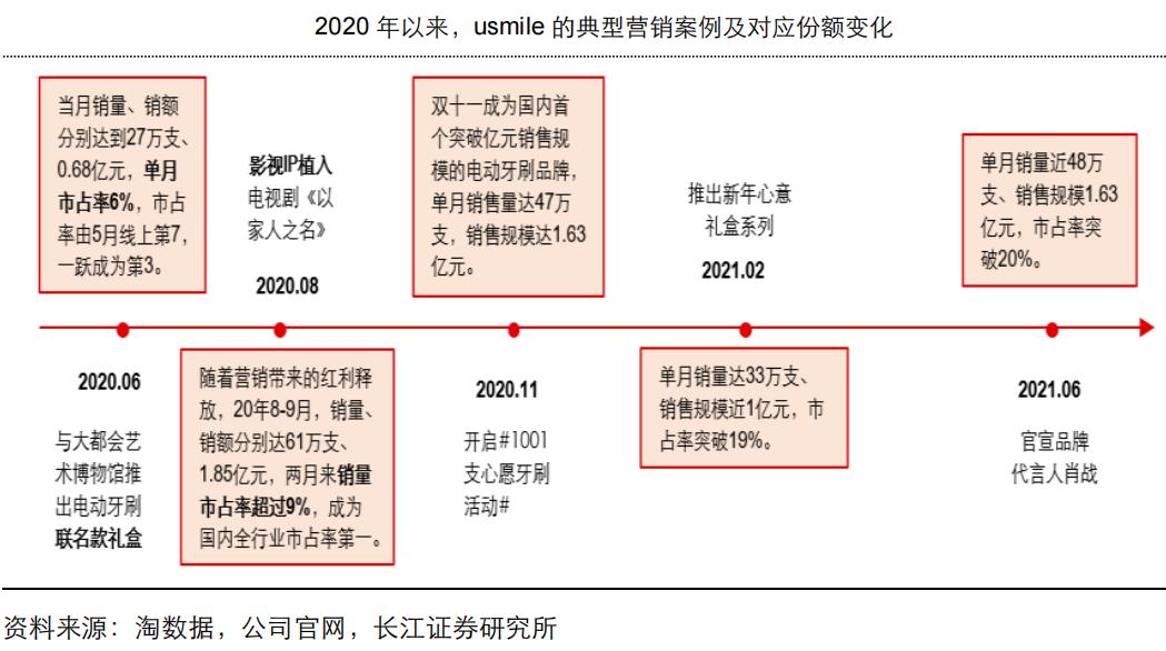 usmile的成功离不开营销理念,其定位15-25岁年轻女性,依靠大量营销投放、爆款新年礼盒,以及品牌代言等。
