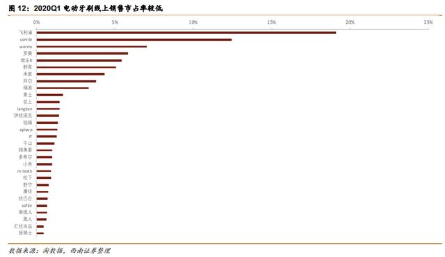 首先是素士的市占率极低。根据西南证券数据显示,截至2020年一季度末,素士的市占率仅有1.7%,不及米家的4.3%,而usmile更是达到了12.5%。