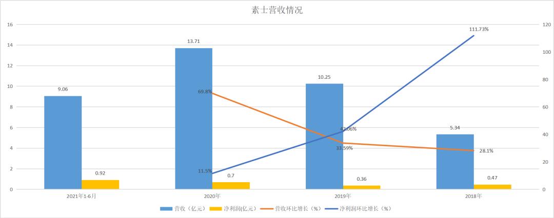 从2015年起家至今,可以看到素士的业绩正在逐年攀升。从2018年的5.34亿元营收,增长到2020年的13.71亿元,再到2021年上半年的9.06亿元,年均复合增长率达60.17%。