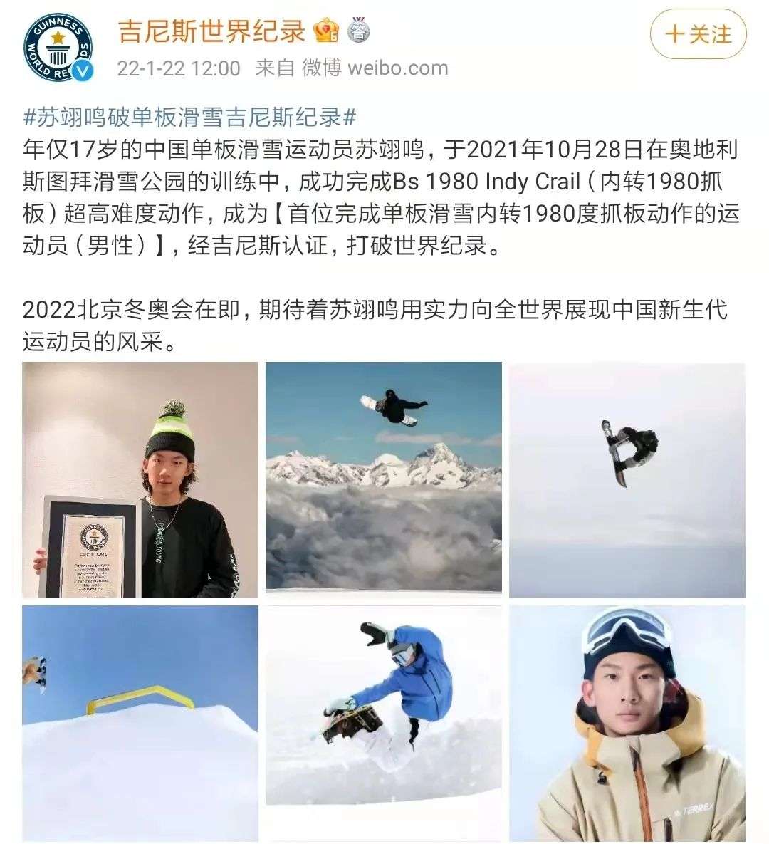 直到2021年10月28日,苏翊鸣在奥地利的训练中成为全球首个完成Bs 1980 Indy Crail(内转1980抓板)超高难度动作的运动员,才逐渐开始积累热度。这一纪录随后在2022年1月,也得到了吉尼斯世界纪录的认证。