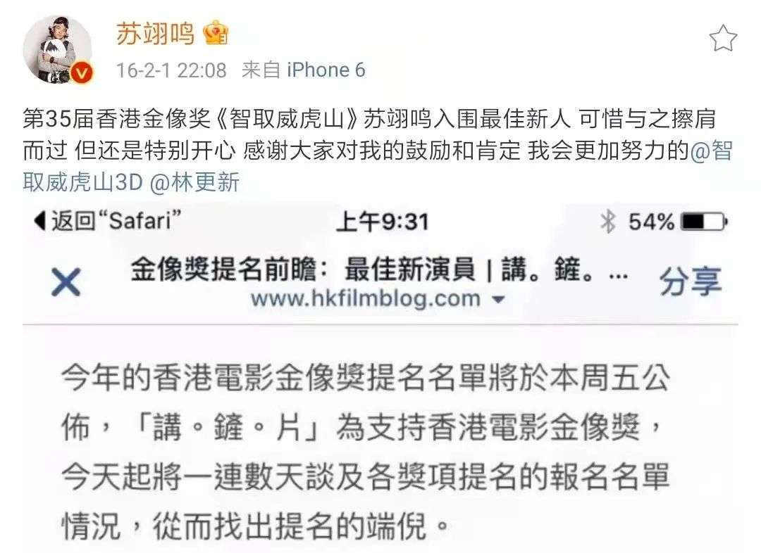 凭借在《智取威虎山》中的表现,苏翊鸣入围第35届香港金像奖最佳新人,可惜最终与奖项擦肩而过。但能够在首次入行影视就进入大名单,也是对苏翊鸣演技的认可。