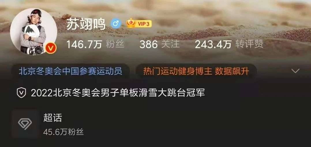 截止记者发稿时,苏翊鸣的微博粉丝数量已经达到了146.7万。勇夺北京冬奥会单板滑雪男子大跳台冠军当天,累计44个相关话题登上热搜,“苏翊鸣金牌”的话题更是引爆全网;超话互动量累计达160万。奥运赛事期间,苏翊鸣涨粉破百万。