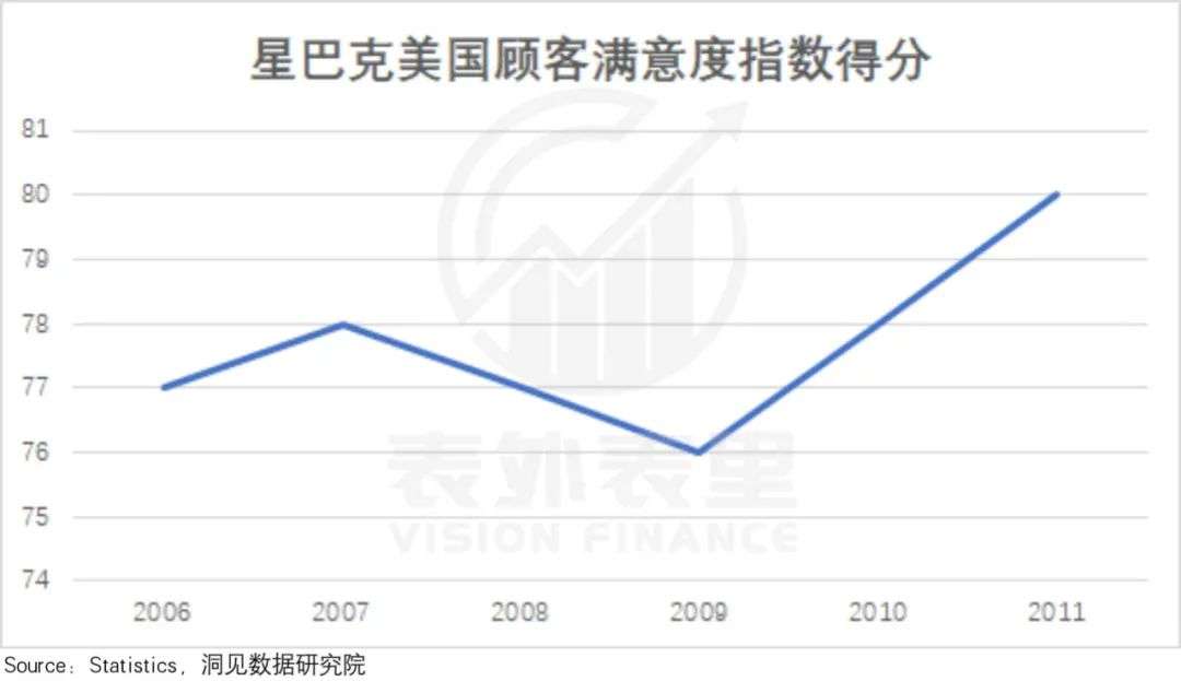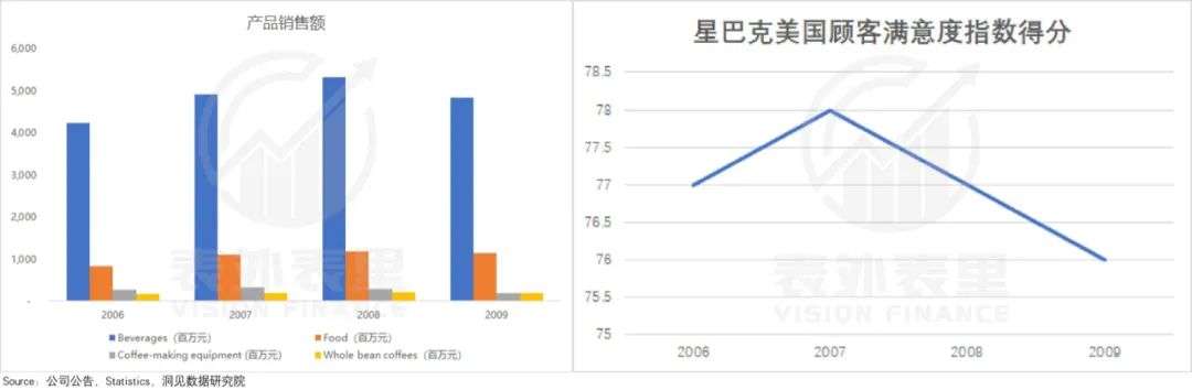 如下图,2008-2009年,星巴克食物品类的销量并没有什么起色;与此同时,其顾客满意度指数,也不升反降。